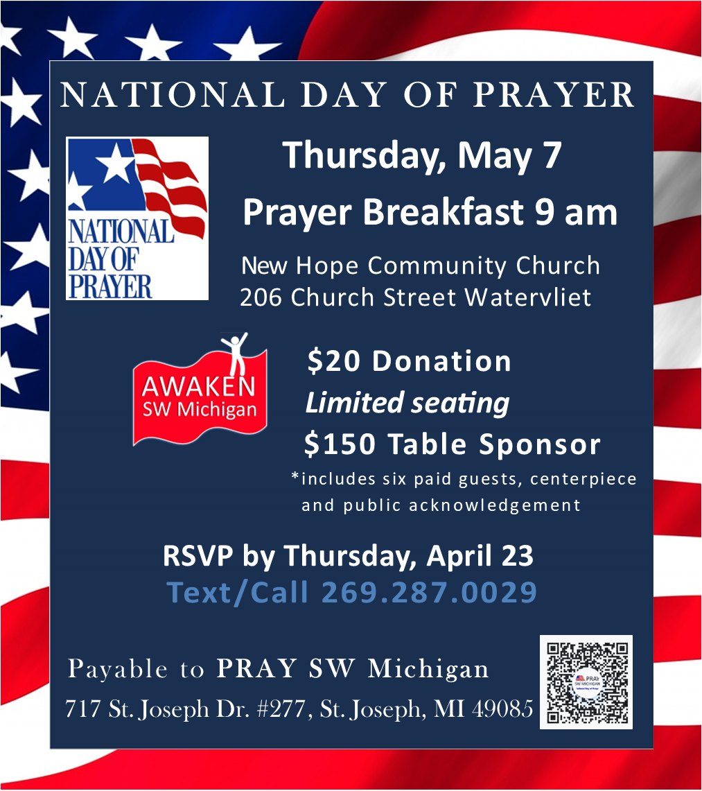 PRAY SW Michigan says there will also be a prayer breakfast at 9 a.m. on May 7 at New Hope Community Church in Watervliet. You can learn more below.